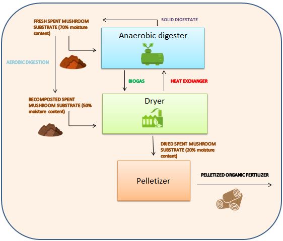 The EU-supported project Smartmushroom has developed and demonstrated a process which uses biogas generated from fresh SMS to dry a mix of digestate and SMS for conversion into pelletised fertiliser. Smartmushroom’s new methanogenic technique uses hydrolysis followed by anaerobic digestion. The resultant biogas powers a drying process with up to 28 % humidity which, by using condensation and adsorption through sepiolite filters, accelerates water removal from the SMS. The dried SMS can then be enriched with natural nitrogen, phosphorus and potassium fertiliser, tailored to specific agricultural needs, before being pelletised. The SMS-based pellets were tested as fertiliser for several crops – including lettuce, cauliflower, pepper, tomatoes, broccoli, vineyard and cereal. This was done in greenhouse and open fields in Serbia and Spain. The project built an SMS-ADryer pilot plant at Sustratos de La Rioja, the authorised mushroom waste manager in the region. The anaerobic digesters are installed in a modular container version, as opposed to a concrete building, to accommodate varying SMS quantities. The dryer is composed of a burner which dries the SMS to the humidity required by the production line making the pellets. The system also offers environmental benefits, as the process is carbon sequestrating, transferring atmospheric carbon dioxide into the soil. It also helps mitigate soil degradation by adding fertiliser with up to 50 % organic matter.