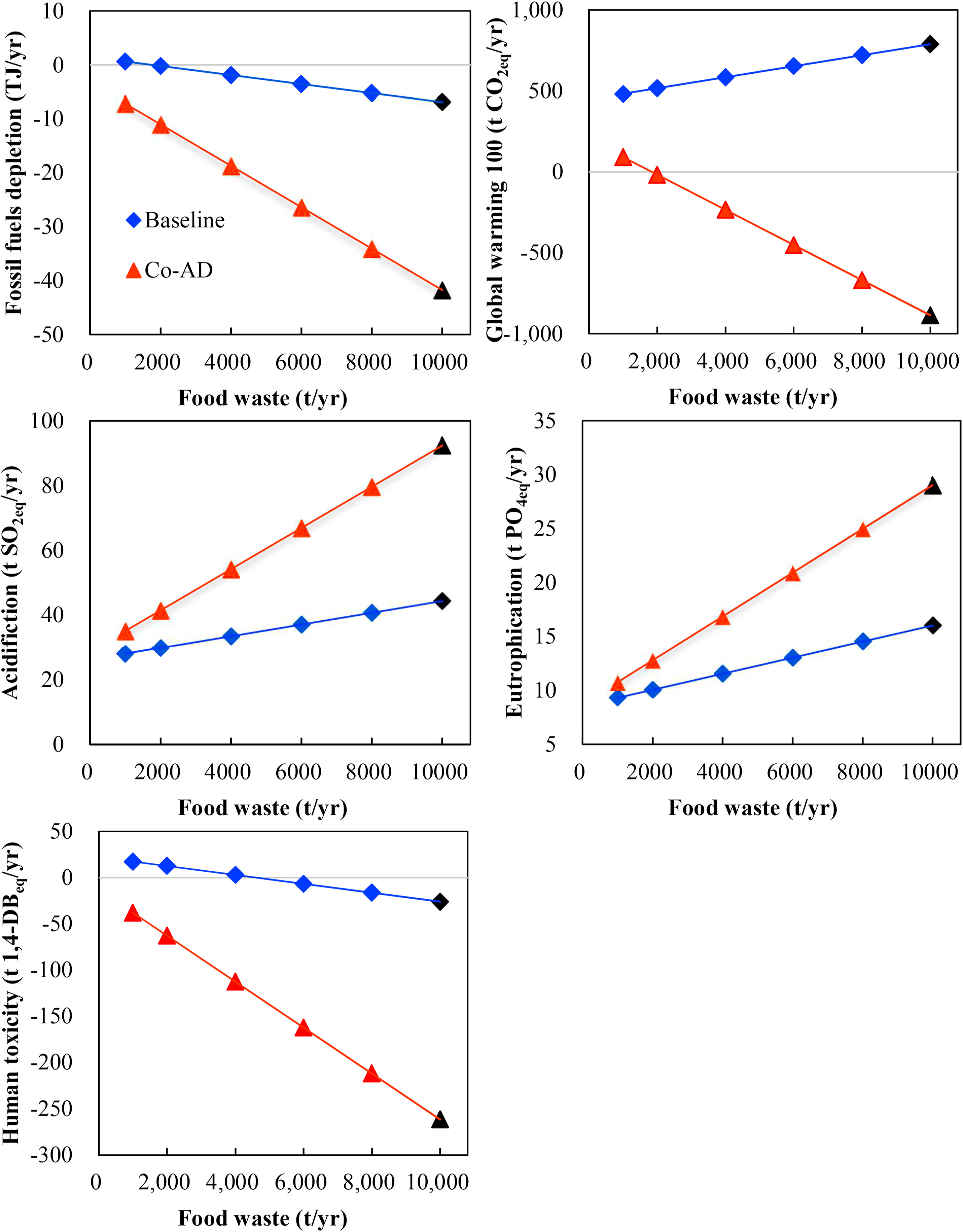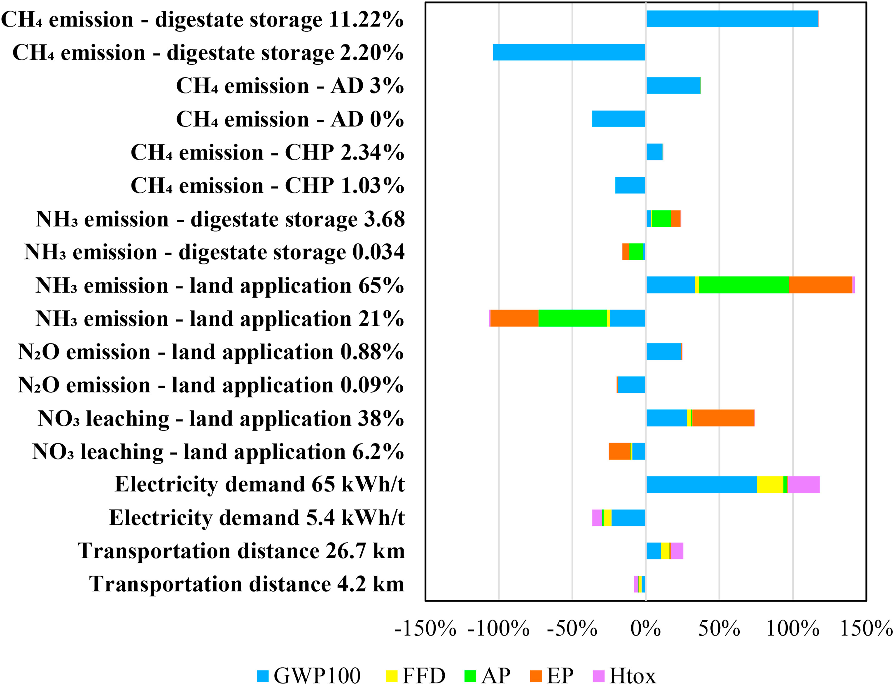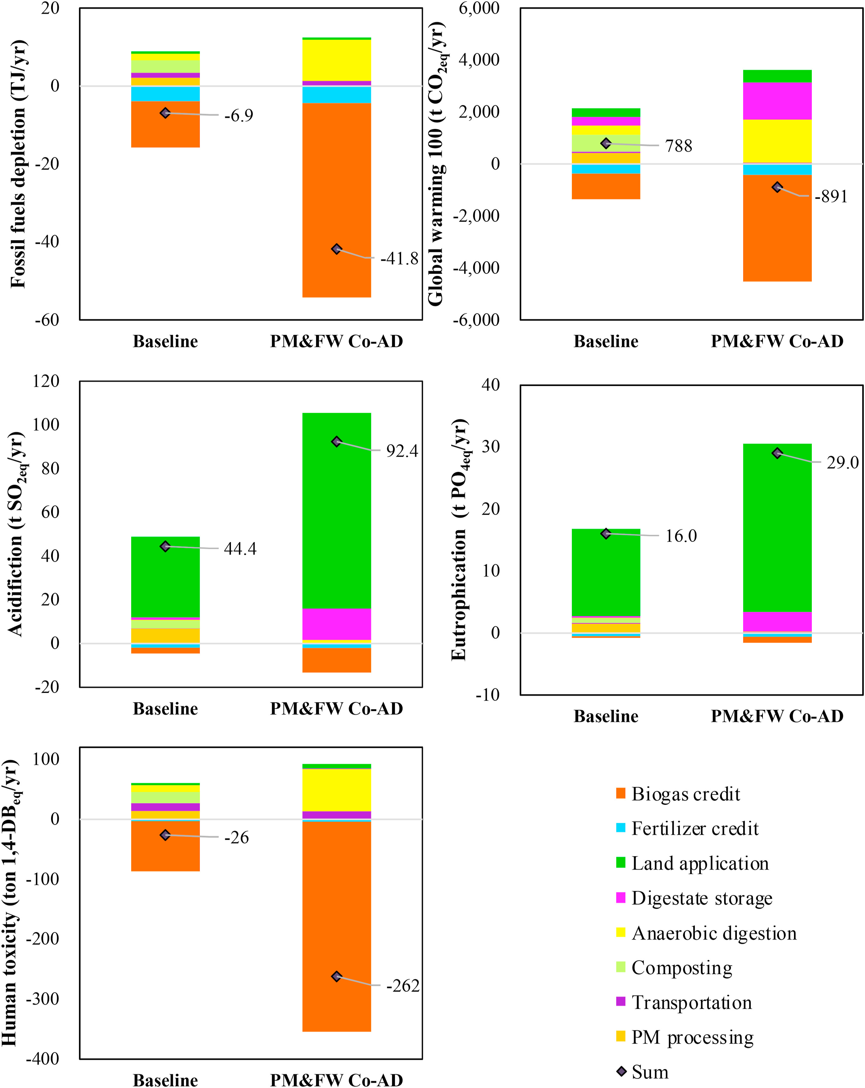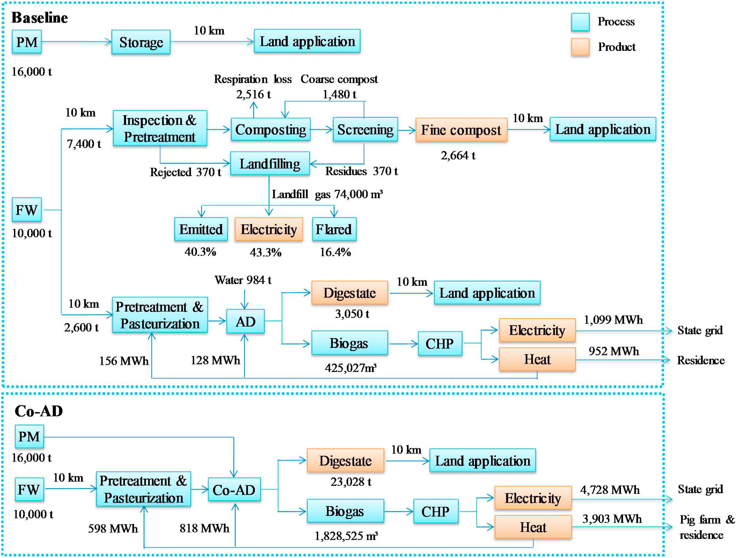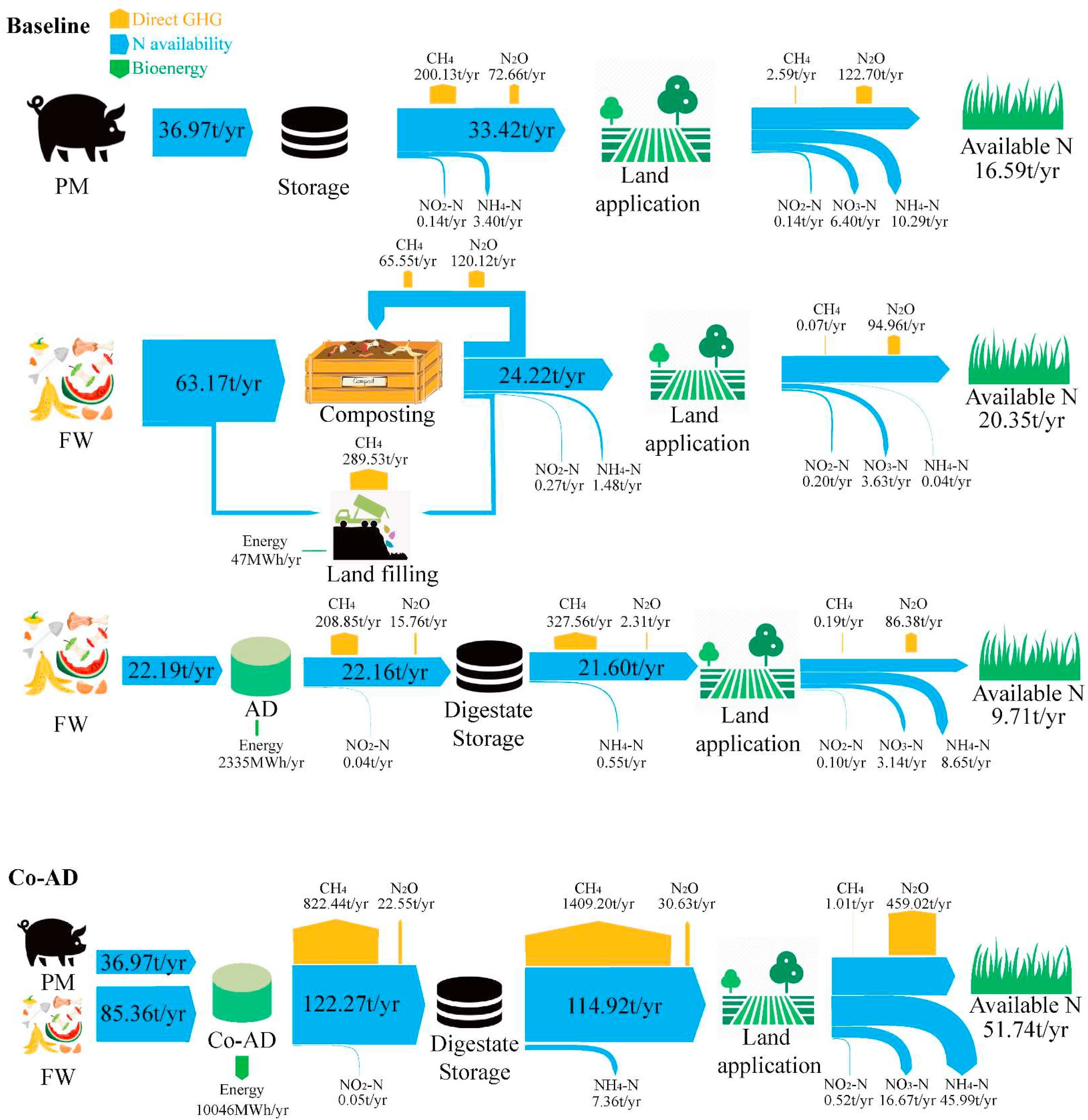 This study compares the environmental impacts of present PM and FW management strategies with an alternative co-digestion scenario. The co-digestion scenario performs better in most environmental impacts, and the N availability of the digestate is superior as well. Hotspots greatly influencing the environmental impacts are identified and mitigation methods are proposed. A low FW proportion in the co-digestion scenario cannot offset the negative impacts caused by the introduction of FW. For a farm with a PM production of 16,000 t/yr, at least 2000 t/yr FW is needed to ensure a negative GWP. These results can provide practical references to pig farmers, the gas industry and policy makers.